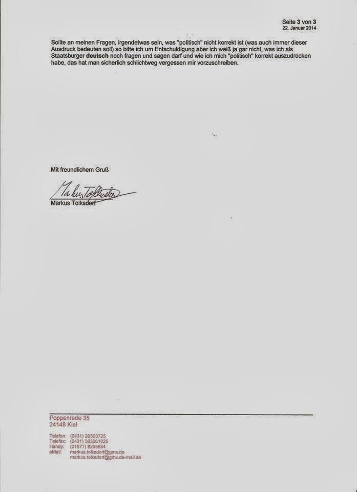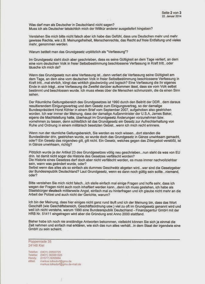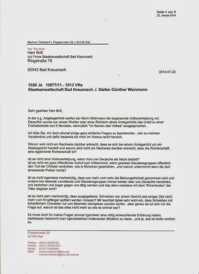 Seine geschickte Taktik, Berufung einzulegen und dann bei der Verhandlung nicht zu erscheinen, ging nicht auf. Bei Facebook und auch in seinem Blog, klammert er sich momentan an jeden Strohhalm. So sieht er auch den Verfassungsschutz, der in das Geschehen involviert sein soll und auch die JOH (in Form von Martin Tolksdorf) hat seitenlange wirre Schreiben verfasst (siehe Bilder am Ende des Artikels).