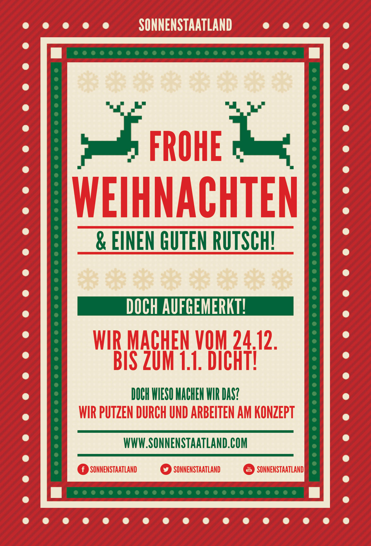 Deshalb haben wir uns dazu entschlossen, das Forum vom 24.12.2014 – 12 Uhr bis zum 1.1.2015 – 12 Uhr zu schließen. In dieser Zeit werden wir kräftig aufräumen und uns überlegen wie man dem Verfall der Sitten und Gebräuche im Sonnenstaatland etgegenwirken kann.