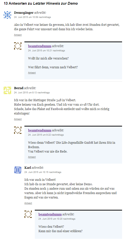 Unser Freund Beamtendumm hatte für heute wieder eine Demo geplant. Wir halfen ihm dabei, das Ganze im Internet zu verbreiten. Leider ist uns bei der Adresse ein kleiner Fehler unterlaufen und statt “Hattinger Straße in Bochum” hatten wir “Hattinger Straße in Velbert” geschrieben, da es dort auch eine Straße gleichen Namens gibt. So kam es bei den Demonstranten zu Missverständnissen: