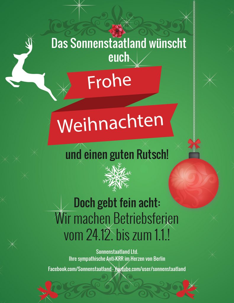 Wir wünschen euch besinnliche Feiertage und einen guten Rutsch in das neue Jahr! Schaut in der Zwischenzeit auch mal bei unseren Partnerblogs sowie auf unserer Facebookseite rein. Auf Facebook versorgen wir euch über die Feiertage mit allen Neuigkeiten rund um Reichsbürger, Querulanten, Mahnwachen und Chemtrails. Sollte etwas Großes passieren, berichten wir natürlich auch auf unserem Blog darüber.
