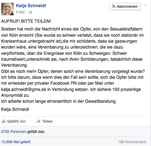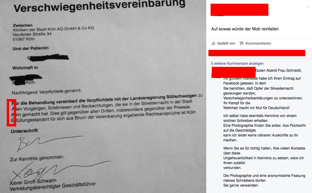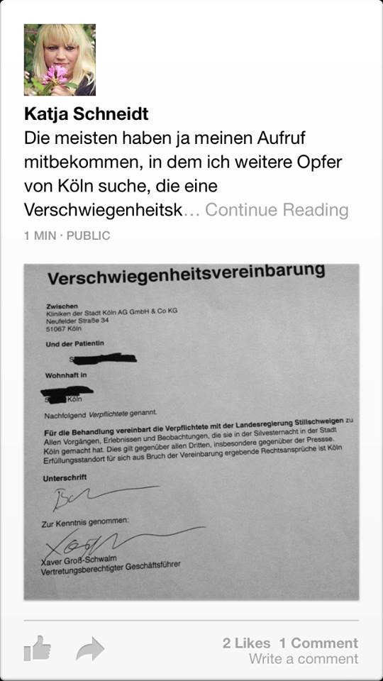 erhielt ein anonymisiertes Schreiben einer Patientin, welche in der Neujahrsnacht in Köln in einem Krankenhaus behandelt wurde und dort auch noch eine Verschwiegenheitserklärung unterschreiben musste.
